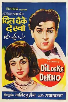 Dil Deke Dekho (transl.Try Giving your Heart) is a 1959 Indian Hindi romantic comedy film. It was Nasir Hussain's second film as a director after Tumsa Nahin Dekha (1957), which became a big hit and gave star Shammi Kapoor a new image as a comedic, dancing hero. Hussain and Kapoor reteamed with this film. also in this, Asha Parekh, a former child actress, made her film debut as a heroine. This is also music composer Usha Khanna's first film.