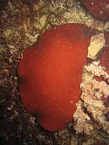 This large alga is dark red, flattened and somewhat leathery. It may be 30 cm or more long and 15 cm wide. It is usually not branched but may split.[2] It grows from a small discoid base.[3] The mature blade has a compact medulla enclosed within a cortex of rounded cells inwards and outwards of close radial filaments of about 6 cells.[4] It grows from a discoid holdfast with a short stipe.[5]