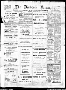 The Dimboola Banner has a publishing history of nearly 135 years. The first issue was published on 10 May 1879.[1] After successful years of publishing a takeover bid was made in 1921, the bid failed and an opposing newspaper, Dimboola Chronicle, went into publication.[2] The Banner remained robust and absorbed the Chronicle in 1930.