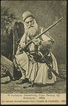 After Greek independence, Tsamis Karatasos continued the struggle to liberate his native Greek Macedonians, taking part in an 1854 liberation movement in Chalkidiki. He was one of the prime instigators of the revolt, during which he became known by the epithet Yero (Greek: "γέρο" meaning "elder one"), as Yero-Tsamis or Yero-Karatasos.[1] The insurrections had the support of King Otto of Greece who thought that the liberation of Macedonia and other parts of Greece was possible, hoping on Russian support.[2] The revolt, however, failed in its part having deteriorated the Greco-Turkish relations for the years to come.