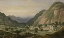 Dinas Mawddwy, looking south with Moel Dinas on the right, painted in 1830 by Alphonse Dousseau.