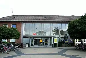 In 1916 a new entrance building was built. This was almost completely destroyed in the Second World War along with the other facilities at the station on 23 March 1945.[9] 100 years after the opening of the first station, the current station building was opened on 10 July 1956. It is a two-story building with a flat hip roof. The counter area, which is two storeys high, is marked by a limestone framed glass facade.[10]