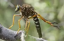 Many observations of the suspended feeding posture of Diogmites were caught on camera, for example Herschel Raney's webpage for Dasypogoninae includes images of D. angustipennis, D. platypterus and D. missouriensis feeding on a variety of insects.[4] Chris Thawley has an interesting video of a feeding adult manipulating a large prey wasp while in hanging posture.[5] Observations of the moment of prey capture are unfortunately not recorded yet in any literature or web resources. Some species can assume an unusual flight posture, with the first and last leg pairs raised high while the middle legs are extended downwards (personal observation of low-flying D. angustipennis males and females in central New Mexico). This might represent a peculiar type of hunting-related behavior more commonly referred to as orientation flights, or perhaps might serve purposes unrelated to hunting, such as a defensive posture to reduce odds of capture by dragonflies or other robberflies, or behavior intended to facilitate latching onto plant stems and leaves for landing.