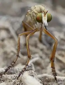 Legs comparatively long with prominent bristles, the length of the hind legs often roughly equals the length of the entire body. Forelegs about two-thirds as long as hind legs, with a short but distinctive curved spine at the anterior edge of each tibia. The claws of the hind legs are less than twice as long as the pulvilli. As is typical for Dasypogoninae, the harder cuticle of the prosternum is separated from the neck by an area of flexible cuticle that presumably allows for greater freedom of movement of the forelegs. This feature also occurs in some members of other asilid subfamilies.[1]
