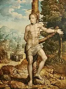 He worked on the Church of São Silvestre in Unhos, contributing two tableaus dedicated to St. Sylvester, showing scenes of his life, to the church altarpiece (made 1537-1538) and four panels with images of other saints (made 1560-1570).[3] The church has been declared a monument of public interest by the Portuguese government.[4] The scenes of St. Sylvester's life shown are St. Sylvester resurrecting a bull in Zambri and converting the Emperor Constantine.[5] The other panels, possibly originally made for a second altar or a sacristy, show St. Roque, St. Peter, St. Sebastian and St. Bras.[5]