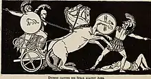 Pandarus throws his spear first and brags that he has killed the son of Tydeus. The latter responds by saying "at least, one of you will be slain" and throws his spear. Pandarus is killed and Aeneas is left to fight Diomedes (now unarmed). Not bothering with weapons, Diomedes picks up a huge stone and crushes his enemy's hip with it. Aeneas faints and is rescued by his mother before Diomedes can kill him. Mindful of Athena's orders, Diomedes runs after Aphrodite and wounds her arm. Dropping her son, the goddess flees towards Olympus. Apollo now comes to the rescue of the Trojan hero. Disregarding Athena's advice, Diomedes attacks Apollo three times before Apollo warns him not to match himself against immortals. Respecting Apollo, Diomedes then withdraws himself from that combat. Although he has failed in killing Aeneas, Sthenelus, following his orders, has already stolen the two valuable horses of Aeneas. Diomedes then became the owner of the second best pair of horses (after Achilles' immortal ones) among Achaeans.