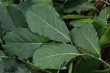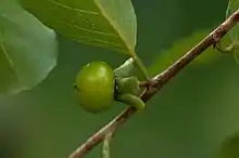 The bark is grey to brown, and smooth with shallow longitudinal fissures.[3] It grows from 2 to 10 metres tall, and may start flowering while still small.[2] They produce flowers from early to midsummer, which are greenish to creamy-white and fragrant.[1] The flowers are axillary, in lax cymes in males plants, and solitary in female plants.[3] The near-spherical fruit (of female plants) are some 2 cm in diameter. They ripen to a dark yellow colour, and contain 8 to 10 seeds.[3] The calyx lobes are conspicuous. The dull green leaves have clear net-veining on their undersides,[1] and become glabrous when fully grown.