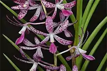Dipodium ensifolium, commonly known as leafy hyacinth-orchid,[3] is an orchid species that is endemic to north-east Queensland. It has sword-shaped leaves and up to twenty pink to mauve flowers with purplish spots and blotches.
