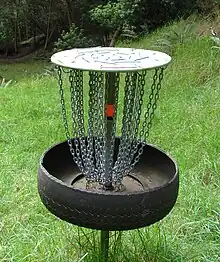 A basket, sometimes also called pole hole, flying disc entrapment device or disc golf net,[1] is by far the most common type of target used in disc golf. It features a disc-catching basket under a deflection assembly generally made out of chain.[2] Permanent baskets on courses are built on an anchored metal pole, but portable disc golf baskets with foldable mechanisms to facilitate transportation also exist.[3][4]