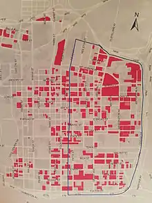 An outline of the Discovery District with red areas as an indication of parking lots located in the district in 2015