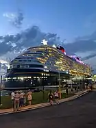 On June 9, 2022, Disney Wish was officially handed over to Disney Cruise Line, with the shipyard stating that the ship sailed to Portugal and Castaway Cay before her transatlantic voyage to Port Canaveral.[24] She arrived at Port Canaveral on June 20, 2022, where she was welcomed by Mickey and Minnie Mouse.[25] On June 21, 2022, the ship's first test cruise was cancelled, due to the ship not being ready.[26] The following day, the second test cruise scheduled for June 24, 2022 was also cancelled to focus on the christening ceremony.[27][28] On June 24, 2022, all past, present, and future Make-A-Wish children were announced to be the godchildren of the ship.[29] On June 29, 2022, Disney Wish was officially christened by three ambassadors of the Make-A-Wish children before embarking on her 3-night christening cruise for the media to Castaway Cay.[30]