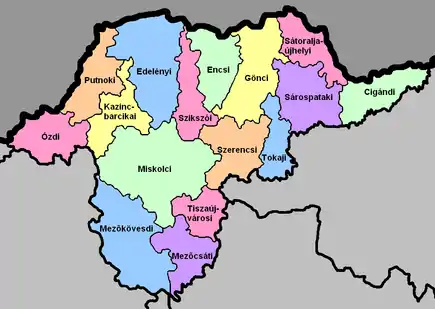 | 13 | Szerencs District | Szerencs | 432.09 | 38,259 | 89 | 14 | 1 |