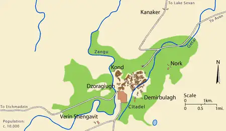 Kond (Armenian: Կոնդ), so-named because of its high position. It was also known as Tapabashi (Turkish: tepe - hill, baş - head, top; "top of the hill") during the Persian rule. Kond located in the western part of Yerevan. According to Hovhannes Shahkhatunyants, an Armenian historian, Kond located in the western and southern hillsides and foot of a rocky hill with similar name. Its western border was Hrazdan River, and the northern border was the Kozern Cemetery. Kond, similar to Shahar, was populated by Armenians. The population of Kond became multiethnic, when about 100 Armenian Boshas moved to Kond.[8]