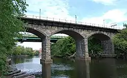 The Division Street Bridge is an historic roadway and sidewalk stone arch bridge in Pawtucket, Rhode Island, carrying Division Street over the Seekonk River. The structure was built in 1875–1877 at a cost of USD$95,000. It is a nine-span stone and brick bridge with a total length of about 450 feet (140 m), making it the "finest and longest" stone arch bridge in the state. It is said to be a symbolic icon of the unity of the two neighborhoods, which are divided by the river, coming together as the Town of Pawtucket. The bridge was listed on the National Register of Historic Places in 1983. Although it may be "functionally obsolete" relative to traffic patterns and in need of repairs, it is considered to be architecturally and historically significant.