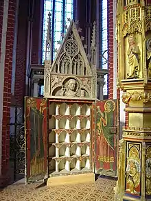 Around 1350 the lower row was added, depicting the apostles and the two patron saints St. Sebastian and Pope Fabian. The upper row on the left wing shows: John the Baptist, the annunciation of Mary, the birth and dedication of Christ. On the right wing: the scourging of Jesus, Jesus carrying the cross, the crucifixion and the resurrection. The middle row on the left wing shows: Eve, Sara, the closed gate, the burning bush and the dedication of Samuel. On the right wing: Moses striking the rock, the suffering of Job, Abraham offering Isaac, the iron serpent, Samon and the city gates of Gaza. The lower row on the left wing shows: St. Fabian, apostles Bartholomew, Thomas, Simon, Matthew, Andrew and Peter. The right wing shows: apostles Paul, Jacob the elder, Evangelist John, Phillip, Judas the Galilean, Matthew and St. Sebastian.