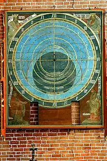 Above the western entrance is the face of the astronomical clock, which was destroyed during the 30 year war. It was built in 1390 by Nikolaus Lilienfeld according to the belief of a geocentric universe. The clock was originally located on the western wall of the southern transept, above the steps to the monks dormitories. The four corners depict famous philosophers and astronomers of ancient times.