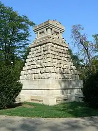 The park is named after the monument of the fallen medics during the Russo-Turkish War (1877–1878), most of whom worked for the mission of the Russian Red Cross Society and perished in the battles at Pleven, Plovdiv, Mechka and Shipka. The monument was constructed between 1883 and 1884 by the Russian architect of Czech origin Antoniy Osipovich Tomishko.[1]
