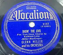 "Doin' the Jive" is a 1938 song composed by Glenn Miller and pianist Chummy MacGregor.[1] The song was released as a 78 single by Glenn Miller and His Orchestra on Brunswick.[2]
