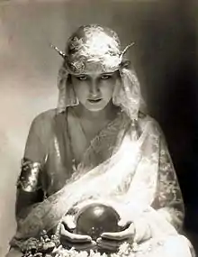 ![]() Dolores with a Mercury headdress and a crystal ball in a wedding dress spread for Vogue, 1919. Photographer: Adolph de Meyer. | |