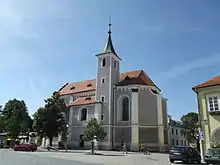 In the centre of the town square there is the Church of the Nativity of the Virgin Mary. It was first mentioned in 1385. It was baroque rebuilt in 1751–1756, but retained Gothic elements. It is known for its leaning, 56 m (184 ft) high tower.[12]