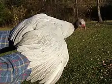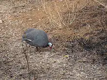 Domestic guineafowl, sometimes called pintade, pearl hen, or gleany, is poultry originating from Africa. They are the domesticated form of the helmeted guineafowl (Numida meleagris) and are related to other game birds such as the pheasants, turkeys and partridges. Although the timing of their domestication is unknown, there is evidence that domestic guineafowl were present in Greece by the 5th century BC.[1]