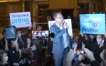 Amid the countrywide anti-corruption protests in the winter of 2017, he joined the liberal party Save Romania Union (USR), which nominated him as a candidate for the upcoming local election,[15] for which he moved from Berlin to Timișoara in 2019. His candidature was also supported by the local branch of the Democratic Forum of Germans in Romania (FDGR/DFDR). In the 27 September 2020 election, Fritz won with 53.25% of the votes against incumbent Nicolae Robu, the National Liberal Party (PNL) candidate, who had sought a third term in office.[16] Robu, former rector of the Politehnica University of Timișoara, had previously refused an electoral debate with Fritz and in a nationalist campaign[17] called him a "foreign adventurer" who regarded Romania as a cow to be milked.[18] His investiture was delayed by appeals filed in court by PNL sympathizers, since Fritz does not have Romanian citizenship.[19] However, according to Law no. 115 of 2015, EU citizens have the right to be elected as mayor, local councilor, county councilor, and president of the county council anywhere in Romania, provided they have their official residence in that area.[20] The appeals were ultimately rejected, and Fritz took the oath in the Capitol Hall of the Banatul Philharmonic on 30 October 2020.[21]