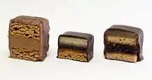 It is a layered confection, related to the Mille-feuille, opera cake, Punschkrapfen, and Jaffa Cakes. Dominostein has a base of Lebkuchen (gingerbread), a middle layer of jelly (e.g. from sour cherries or apricots), and a top layer of marzipan or persipan. It is enveloped in (typically) dark chocolate.[1][2]