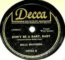 "Don't Be a Baby, Baby" is a song written by Howard Steiner and Buddy Kaye, performed by The Mills Brothers, and released on the Decca label (catalog no. 18753-A). It peaked at No. 3 on Billboard magazine's race records chart and spent eight weeks on that chart.[1] It also reached No. 12 on the pop chart. It was ranked No. 15 on the Billboard's year-end list of the most played race records of 1946.[2]