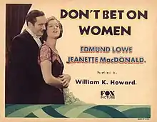 Don't Bet on Women is a 1931 American pre-Code romantic comedy film directed by William K. Howard and starring Edmund Lowe, Jeanette MacDonald and Roland Young.[1]