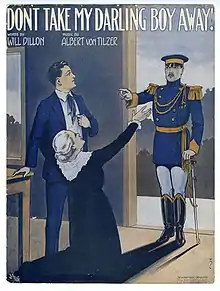 "Don't Take My Darling Boy Away" was a World War I era song about a mother begging a captain to not take away her son to fight. It was written by Will Dillon, composed by Albert Von Tilzer. André De Takacs designed the sheet music cover. The Broadway Music Corporation published it in New York in 1915.[1]