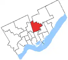 It consisted of the part of Metropolitan Toronto bounded by a line beginning where the Don River would meet Donlands Avenue, east along the Don River, north along the West Branch of the Don River, east along Eglinton Avenue East, north along the Don River, west along Lawrence Avenue East, north along Don Mills Road, west along Bond Avenue, north along Leslie Street, west along York Mills Road, north along Bayview Avenue, southwest along Highway 401, south along Yonge Street, east along Merton Street, south along Bayview Avenue, east and south along the northern limit of the Township of East York, and east along the Don River to Donlands Avenue.