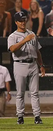Wilbur Donald Wakamatsu (born February 22, 1963) is an American former professional baseball player, scout, coach, and manager. Wakamatsu was drafted in the 11th round of the 1985 Major League Baseball draft by the Cincinnati Reds. He played as a catcher in Major League Baseball for the Chicago White Sox. He served as the bench coach of the Texas Rangers from 2018 through 2021. He was hired as bench coach of the Kansas City Royals for the 2014 season. He was the manager of the Seattle Mariners for the 2009 season, as well as the majority of the 2010 season.[1] He was the Toronto Blue Jays' bench coach for 2011 and 2012, after which he was replaced by DeMarlo Hale.[2][3] During the 2013 season he worked as a scout for the New York Yankees in the Dallas/Fort Worth area.[4] He is currently the first-ever executive vice president of baseball operations with the Oakland Ballers.[5]