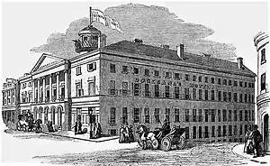 Donegana's Hotel, previously known as Bingham House, stood on the north-west corner of Notre-Dame Street and Bonsecours Street, a block away from Bonsecours Market in the Old Montreal district of Montreal, Quebec. Originally built as a private residence in 1821, the house served as the vice-regal residence of the Governors General of Canada from 1837 until 1843. From 1843 to 1846 it briefly housed the High School of Montreal, before the school built its own premises. The building was then bought by Jean-Marie Donegana, who enlarged it to become the largest hotel in the British Colonies. It became famous across Europe and North America, where its reputation was only equal to, if not exceeding, that of New York's Astor House.[1] Donegana's was burnt down on 16 August 1849,[2] in the aftermath of the Montreal Riots of 1849.