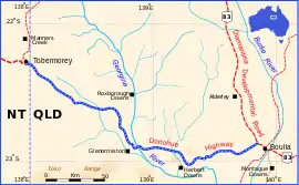 The road branches from the Diamantina Developmental Road 7 km (4 mi) north-west of Boulia and proceeds towards the Northern Territory. The Georgina River is at about the 166 km mark and 83 km further is Tobermorey, a town with 20 inhabitants. From here the trail continues as the Plenty Highway towards Alice Springs.[1] The route is mostly unpaved and marked by corrugations, deep potholes and bulldust (fine red desert dust). However, in 2009 further development in the form of river crossings were initially attached and further parts of the road are paved.[2] Despite the improvements to the track, it is often impassable after heavy rain.[3]
