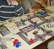 Players in Doom: The Boardgame are on one of two teams: the Invaders, and the Marines. All of the Invader pieces are controlled by one player, and the rest of the players each control one marine piece.[2] Before each game begins, the players must choose a scenario to play in. A campaign consisting of five scenarios is included with the game, and many more have been created using freeware scenario editors. The player controlling the Invaders must get six frags to win,[3] whereas the Marines must reach the exit to win. A "frag" is given to the Invaders if a Marine dies. When a Marine dies, it must respawn between eight and sixteen spaces from where it was killed. A common opinion is that the game is biased in favor of the Invaders - especially with four players. The designer of the game, Kevin Wilson, claims that he can win equally well no matter which team he is playing. Like many board games, it is common to develop house rules (called "mods" to fit the video game theme) to balance the game to players' liking.