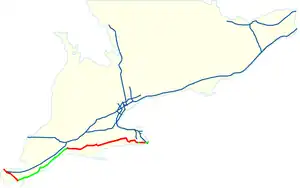 The western segment of Highway 3 begins at the Ambassador Bridge, which connects Canada with the U.S. state of Michigan over the Detroit River. The five lane highway travels southeast through Windsor along Huron Church Road, surrounded by residential subdivisions, then curves east along Talbot Road. The section through Windsor to Cabana Road is maintained under a Connecting Link agreement.[1][5] Between the E. C. Row Expressway and Howard Ave, Highway 3 runs adjacent to the Rt. Hon. Herb Gray Parkway portion of Highway 401.[6] At Essex County Road 11, Highway 3 enters rural southwestern Ontario, and is dominated by farmland for much of its length through Essex County. The now four-laned route becomes divided as it follows the Essex Bypass around the southern edge of Essex, with commercial services lining the highway, primarily on the north side. Returning to farmland and narrowing to a two lane undivided road, the highway continues southeast, passing nearby, but avoiding, several small communities that the original highway travelled through.[7] After passing Essex County Road 18, the route curves eastward, passing north of Kingsville before entering Leamington along its northern fringe.[4] The western section ends at the southern terminus of Highway 77,[1] where the provincially built but county maintained Leamington Bypass continues east to meet the Talbot Road just east of the town.[4]