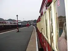 The smaller building that now houses the public and passenger toilet facilities and storage areas was once also used as the railway's own stabling facilities and incorporated porters' accommodation. In more recent times the stables have become garages which are leased out, there being three in total. The fourth old stable has been converted into accommodation and was once used by the night watchman and as storage space. The old porters' rooms were converted into the railway's souvenir shop in 1993 as part of the Year Of Railways and remained as such until the 1999 season when the premises closed and the space was let to the tenants of the station restaurant for storage purposes. When open the shop stocked a range of railway and transport-related publications, videos and magazines as well as a large range of postcards and souvenirs, which are now located at the Isle of Man Railway Museum in Port Erin. What now forms the ladies and gentlemen's' toilets next door was once entirely devoted to the gentlemans' facilities whilst the ladies waiting room was within the administrative structure. This setup was amended when rationalisation of the whole site was carried out in 1979 resulting in the facilities provided today. The toilets are also utilised by customers of the station restaurant and when closed are gated across. At the entrance to the platform there is a shall wooden chalet structure which is used by station staff when checking tickets, it also houses various signage and cleaning equipment. This structure was installed in 1991 replacing an earlier version which was time-expired; this structure was originally in a varnished finish but as part of minor refurbishments in 2009 was painted into the standard maroon and cream livery.