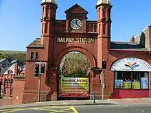 The main entrance to the station is via a grand archway at the junction of Peel Road and Athol Street. This has two gilt-topped turrets and clock tower, between which are a set of steps descending to the station. These gates are usually closed, but there is a smaller gate on the left side of the structure which provides pedestrian access from Athol Street and the financial district. A second entrance at the bottom of the hill from North Quay provides level/vehicular access to the station. Entering down the Peel Road steps, the visitor is faced with two large Ruabon brick buildings. The building ahead of the visitor, which is now used as the Customs House, was constructed as the railway's administrative offices in 1887, and also accommodated, on the ground floor, the Ladies' Waiting Room and lavatory, a licensed refreshment room, and bar. The building to the visitor's right is main station building which originally housed the booking hall, ticket office, parcels office, porters' room, stationmaster's office, to provide storage for millions of card tickets and railway records. This building was designed in 1888, but not constructed until 1891/2, following the abandonment of plans for a steam railway from Douglas, via Quarter Bridge to Onchan and Laxey. The present iron and glass canopy across the front of the building was added in 1909. It now houses a restaurant, installed during extensive interior works in 1991, the booking/stationmasters' office, and a tiny passenger waiting area. The former parcels office was adapted to provide management offices in 1979/80, but has been vacant since management were relocated following the completion of IOM Transport's Banks Circus Headquarters on the site of the carriage shed in 1999. The now vacant upper floor was added to the office area at the north end of the building in 1979, and involved the introduction of a staircase into the building which now divides the original ticket office into two. At the same time, the booking hall floor was sealed using a resin material slightly raising the floor level, and when the mezzanine and kitchen area were installed in 1990/1 a new wooden floor was laid on top of the original raising the floor level by a further 40mm. At the same time, the 1920s ticket window, and 1979 souvenir shop in the centre of the booking hall were removed. In recent years, the north end of the building has experience subsidence due to the presence of a main sewer at that end of the building, and there has been considerable deterioration of the disused office area at the north end of the building. In 2011, a major restoration scheme to underpin the north end of the building repair the roof, and possibly rebuild the old canopy over the circulating area was announced. Roof repairs were completed in 2013, but the rest of the scheme was subjected to a review, the results of which are discussed below. In the active part of the building, seating for the restaurant has increasingly encroached on the passenger facilities within the Booking Hall, and as of September 2014 there is no dedicated seating area for passengers apart from a handful of seats by the door out to the circulating area!