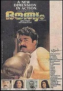 Douthyam (transl. Mission) is a 1989 Indian Malayalam-language action thriller film directed by P. Anil and written by Gayathri Ashokan. The film stars Mohanlal, Suresh Gopi, Parvathy, and Babu Antony.[1] The film attracted media attention for the action subject as the script was done by the poster designer Gayathri Ashokan.