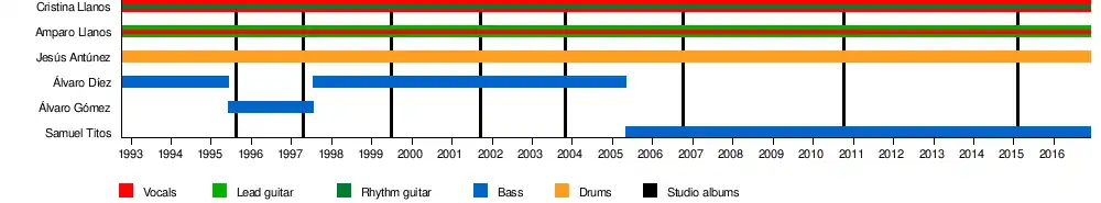 - Cristina Llanos – lead vocals, rhythm guitar (1992–2016)