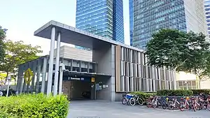 Downtown station is underneath Central Boulevard between the junctions of Straits View and Marina View,[19] and serves the Marina Bay Financial Centre.[18] The station's six entrances connect to surrounding developments and landmarks including Asia Square, Hong Leong Building, Marina Bay Suites, One Raffles Quay, OUE Downtown and SGX Centre.[20] The station has provisions to link with future developments.[21]