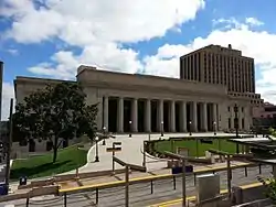 The Minnesota State Capitol is located on the northern fringe of the downtown neighborhood. Work began on the current capitol in 1896, and construction was completed in 1905. The early 1950s saw the development of the expansive mall that currently surrounds the capitol. This development required the demolition of many homes, apartments, churches, and businesses, and paved the way for the construction of four government agency buildings surrounding the mall: Veteran Services Building, the Transportation Building, the Centennial Office Building, and the National Guard Armory.[2] Saint Paul City Hall and Ramsey County Courthouse is also located downtown.