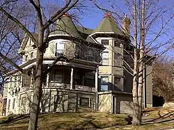 The Matthey house is located a block away from Hilda's parents and even closer to her three brothers. It architecturally embraces a transitional style that combines the Georgian Revival and Colonial Revival styles with elements of the Queen Anne style.[4] The Georgian Revival features include the rectangular form, a high hipped roof, a Palladian window in the dormer, a symmetrical front with the entrance on the right and a columned porch.[5] On the east side of house is a projecting window bay and a tower on the southeast corner of the house that are reminiscent of the Queen Anne style.[5]