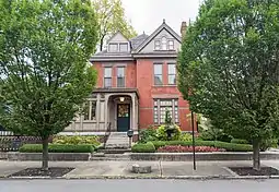 The three-story house was designed in a Victorian style. It has grand and elaborate interiors: its first-story rooms have 10-foot ceilings and details including wood-paneled walls, French doors, plaster crown moldings, elaborate woodwork, stained-glass windows, and marble fireplace mantels. The interior spaces have been easily maintained and restored, as it is one of few Victorian houses in the city that has not been subdivided for offices or apartments.[2]