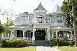 Queen Anne features include asymmetric massing, a turret on the front facade, a wrap-around porch and a central second-floor balcony. It has dormers with paired double-hung windows, a pressed metal mansard roof, and weatherboard siding.[2]