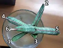 Leaves showing change in leaf morphology as the plant grows. Leaves are numbered 1 to 6 in order from oldest to newest. Leaf 3 has been removed to use for vegetative propagation.