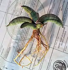 Roots showing thick underground rhizome directly below the leaves, and succulent white roots. The fine roots are dead and dry, but will be regrown once the plant is potted.