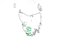 D. milliganii is endemic to western and south-western Tasmania.[3] Found in alpine areas above 850 metres altitude, but can survive lower altitudes in its rainforest form.[2] It is found in harsh, open alpine sites on peaty or well-drained rocky soils in areas of regular snow lie. Along with Isophysis tasmanica its presence is useful in determining communities of Tasmanian highland treeless vegetation, as it appears in western alpine heathland (HHW) and cushion moorlands (HCM).[4]