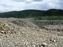 Gold was recovered in a rotating 49.5-foot (15.1 m) long trommel screen with 9.75-foot (2.97 m) diameter and 12.5% grade.[14] A pipe was suspended within the trommel, carrying water upwards to spray the incoming material, cleaning it and breaking up larger lumps.[15] Finer material (gold, sand, and pebbles) was sieved through 0.75-inch (1.9 cm) holes in the screen, which rotated at 7.8 revolutions per minute, into a distributor box.[15] From there, it flowed into sluice tables, long troughs with an area of 1,705 square feet (158.4 m2) which had a constant flow of water.[14][15] About 75% of the gold was caught in a 4-foot (1.2 m) coconut matting and steel riffles at the bottom of the troughs.[15] A smaller distributor captured another 20% of the gold, and all remaining material was washed out into the dredge pond.[15] The larger pieces of gravel were ejected from a 32-inch (81 cm) wide stacker at its rear, a 131-foot (40 m) belt moving at 356 feet per minute (1.81 m/s).[16] These tailings remain as a "vast, rippled blight on the landscape".[3] Particles of gold and nuggets too large to fit through the screen holes would be ejected with the gravel.[7]