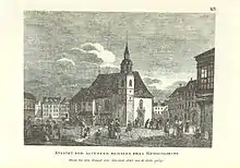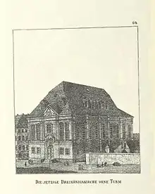 The first Dreikönigskirche was built in 1404 about 200 metres (660 ft) south of the site of the present church in Old Dresden,[1] though the first mention of this church by that name comes from 1421.[2] This placement put the church in what is now the Neustädter Markt, near the centre of Old Dresden. The structure was Gothic in style and had a flat roof over its nave that was topped with two ridge turrets. The church was named for its altarpiece, which depicted the Three Holy Kings. This church was first mentioned in 1421, when the feudal rights over it were passed to the nearby Augustianian monastery following the death of its priest, who had been holding his services at the Erasmi Chapel of the White Gate. The first Dreikönigskirche was destroyed by the Hussites around 1429 but it was rebuilt between 1514 and 1520, still in the Gothic style. During that reconstruction, the church was expanded into a three-aisled hall church with a choir.[1]